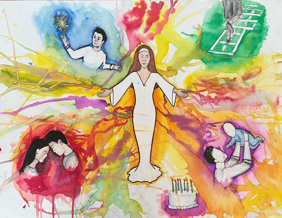 My AP Art project, depicting the stages of life from before birth to beyond death in colorful mixed media - lots of ink, watercolors, colored pencils...