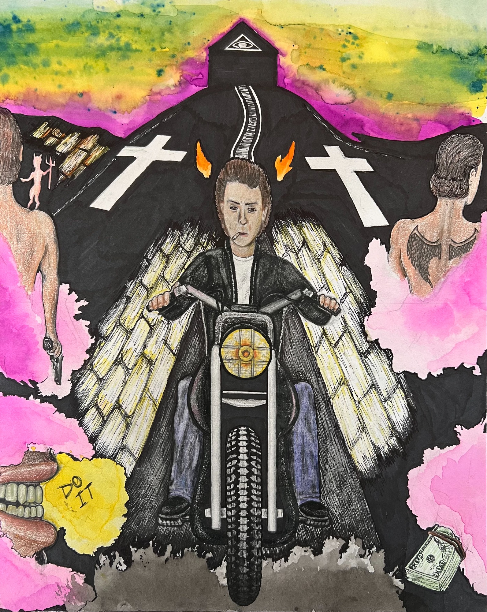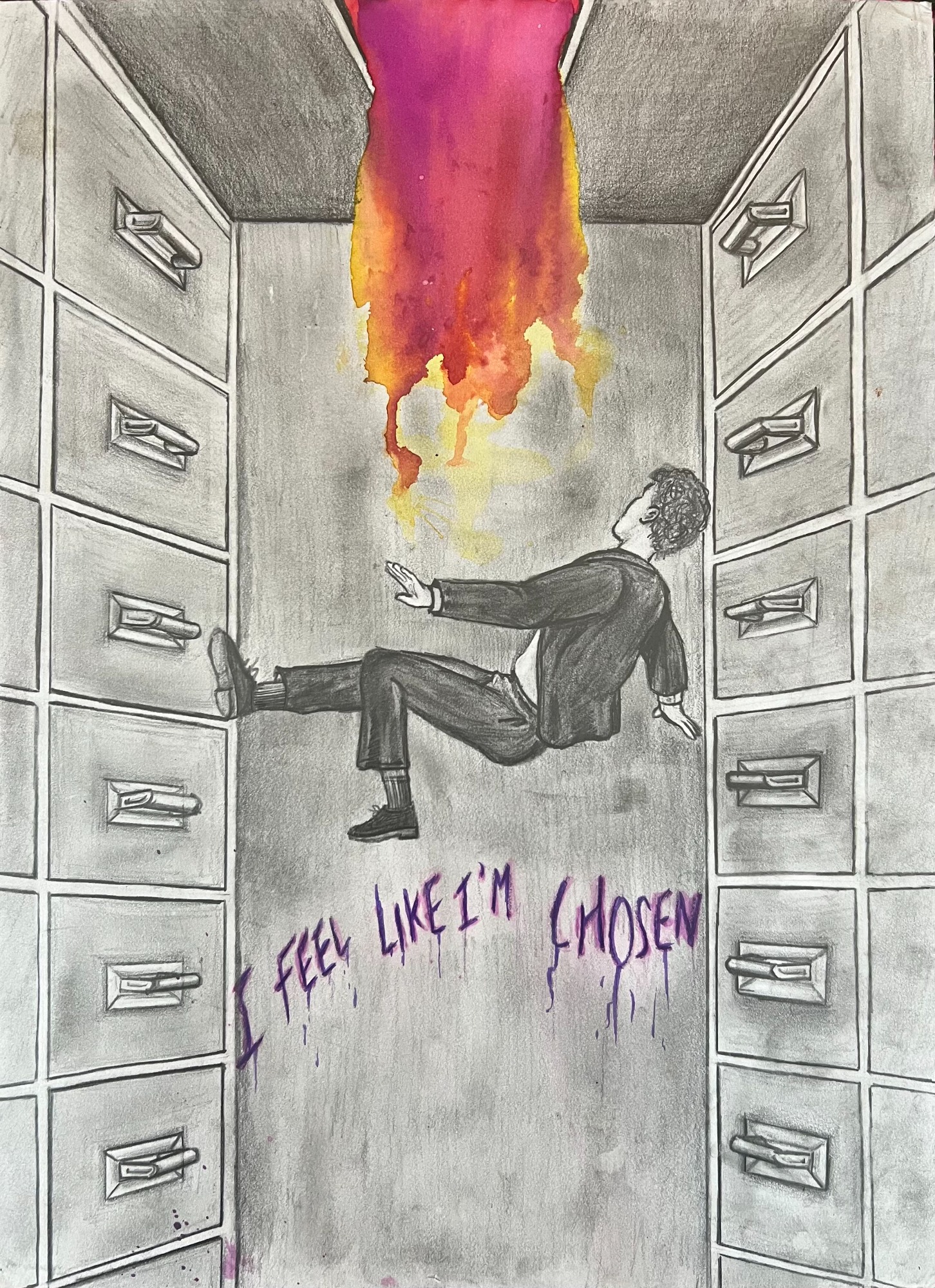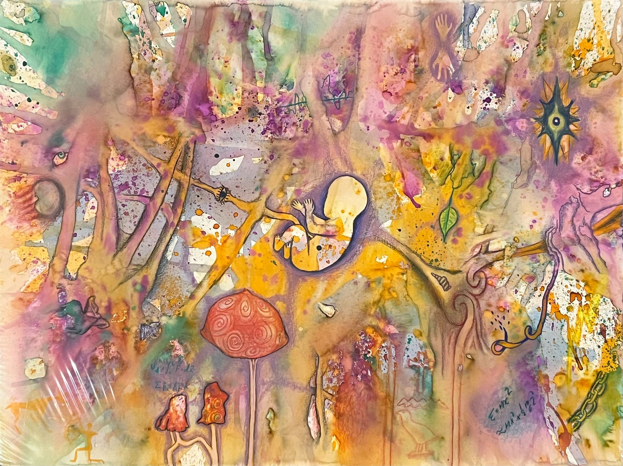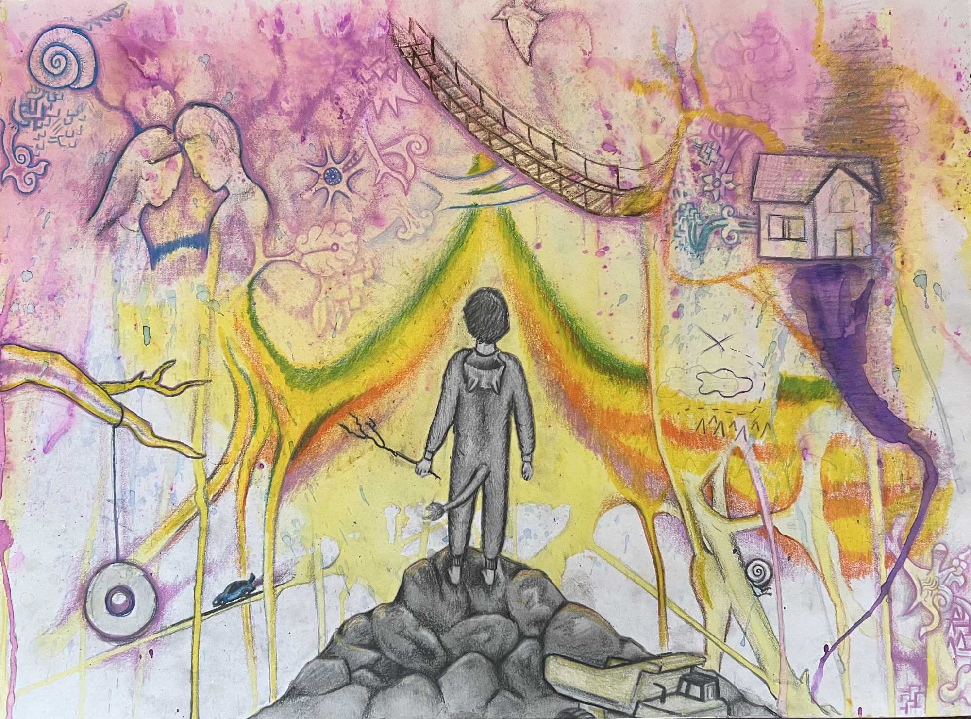 My AP Art project, depicting the stages of life from before birth to beyond death in colorful mixed media - lots of ink, watercolors, colored pencils...